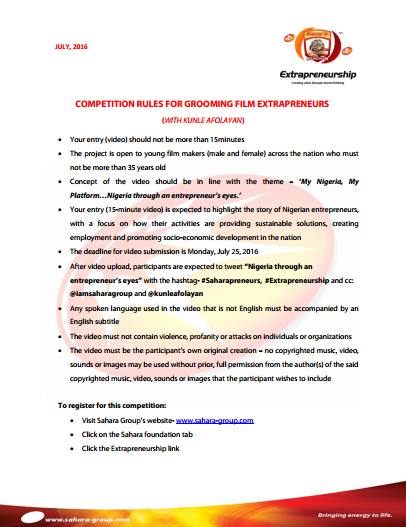 The competition is set to run from July 1st 2016 to July 25th 2016 and will require young film makers in Nigeria to channel their creativity into celebrating entrepreneurship in Nigeria by shooting a 15-minute documentary that captures entrepreneurs at work across the nation with the theme: ‘My Nigeria, My Platform…Nigeria through an entrepreneur’s eyes'. The documentaries is expected to highlight the story of Nigerian entrepreneurs, with a focus on how their activities are providing sustainable solutions, creating employment and promoting socio-economic development in the nation.